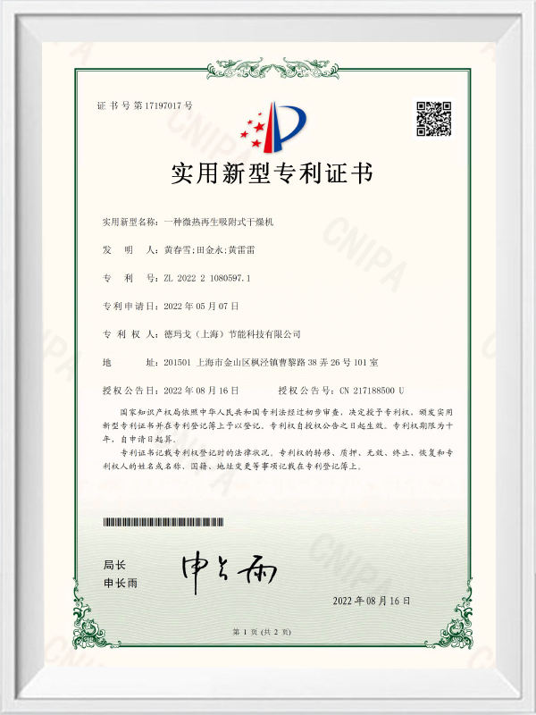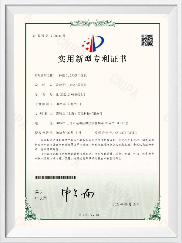 یک گواهی ثبت اختراع مدل خشک کن بدون فشار گرمایش