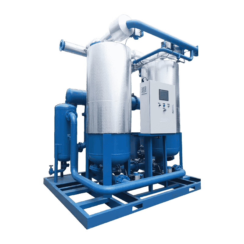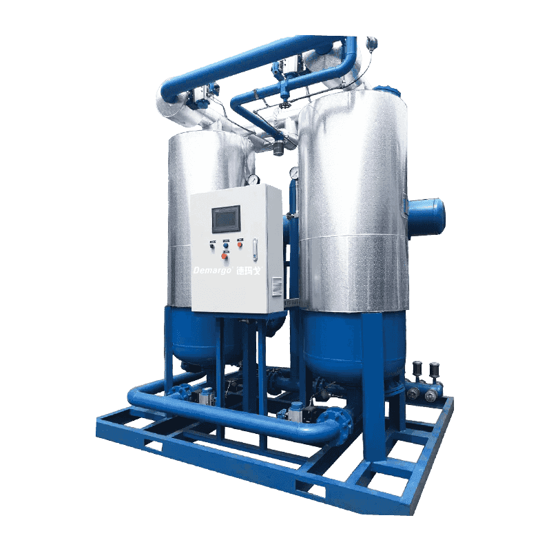 خشک کن گرمای زباله فشرده شده از گرمای زباله کمپرسور هوای بدون روغن برای گرم کردن و بازسازی جاذب استفاده می کند. این باعث می شود از گرمای زباله در سیستم هوای فشرده استفاده کامل شود. بدون استفاده از دستگاه گرمایش ، می توان اثر خشک کن گرمایش را نیز بدست آورد که خصوصیات صرفه جویی در مصرف انرژی آن را به طور کامل نشان می دهد. نقطه شبنم گاز تمام شده می تواند به -40 برسد. از یک کنترلر PLC خود توسعه یافته استفاده می کند ، که پایدارتر و قابل اطمینان تر از میکرو رایانه های تک تراشه است. شیر کنترل از شیر پروانه ای برای اطمینان از تعویض بدون مشکل بیش از 1 میلیون بار استفاده می کند. طراحی پیشرفته Diverter به هوای فشرده شده اجازه می دهد تا با جاذب به طور مساوی تماس بگیرد و پدیده جریان کانال را از بین ببرد .